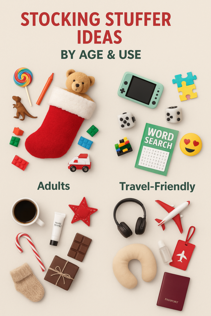 Finding stocking stuffers that are fun, useful, and easy to order doesn’t have to be stressful. Whether you’re shopping for toddlers, big kids, adults, or planning ahead for travel, this guide breaks down stocking stuffer ideas by age and use — Use this list to save time, avoid last‑minute panic buys, and fill stockings with items families will actually enjoy and use.
